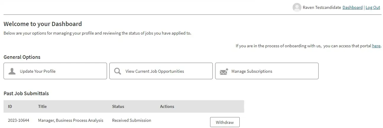 Log in to your Candidate Dashboard. On the dashboard, you can view the Past Job Submittals section to review the status of your application. All submitted applications will be listed here, along with the current status of your application. Here's an example of what your Candidate Dashboard will look like.